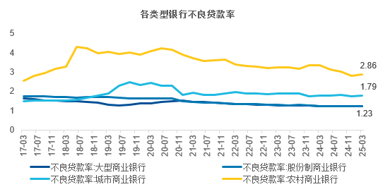 对比各类型银行的不良率,国有大行和股份行凭借广泛的客户基础和严格的风控,近年来平均不良率低于1.5%,而城商行和农商行的不良率则相对更高。