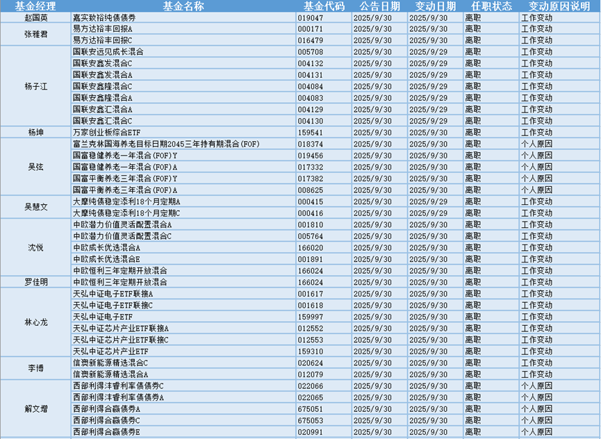 根据巨灵统计的数据显示,近30天(8.31-9.30)共有566只基金产品的基金经理发生离职变动。其中今天(9.30)有40只基金产品发布基金经理离职公告,从变动原因上来看,有12位基金经理是由于工作变动而从管理的37只基金产品中离职。有3位基金经理是由于个人原因而从管理的18只基金产品中离职。