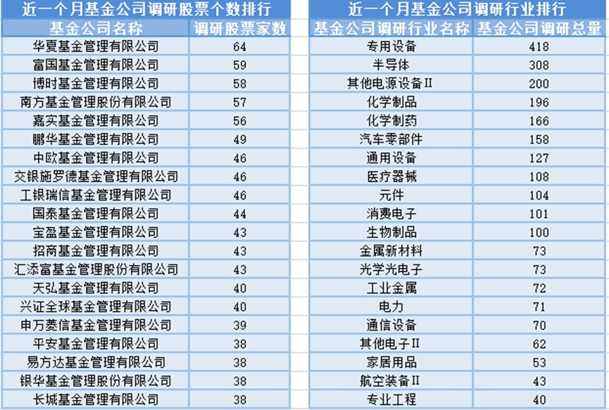 近一个月(8月31日-9月30日),华夏基金参与公司调研的数量最多,共调研64家上市公司,然后调研较为活跃的还有富国基金、博时基金和南方基金,分别调研59家、58家、57家上市公司;从调研行业上来看,基金公司对专用设备行业的上市公司调研次数最多,共有418次,其次是半导体行业,基金公司调研了308次。