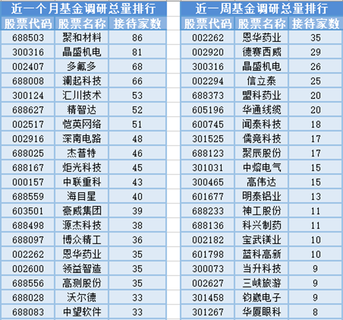 从个股调研情况上来看,最近1个月(8月31日-9月30日)最受公募基金关注的是聚和材料,属于光伏设备行业,主营业务为新型电子浆料研发、生产和销售。共有86家基金管理公司参与调研,其次是晶盛机电和多氟多,分别接受81家、68家基金管理公司的调研。
