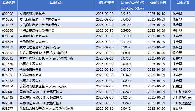 (1)09月30日新发基金共有14只,主要为债券型基金和ETF联接基金基金,其中宏利嘉利债券A募集目标金额达60.00亿元;基金分红18只,多为债券型,派发红利最多的基金是泓德优势领航灵活配置混合型证券投资基金,每10份基金份额派发红利2.9150元。