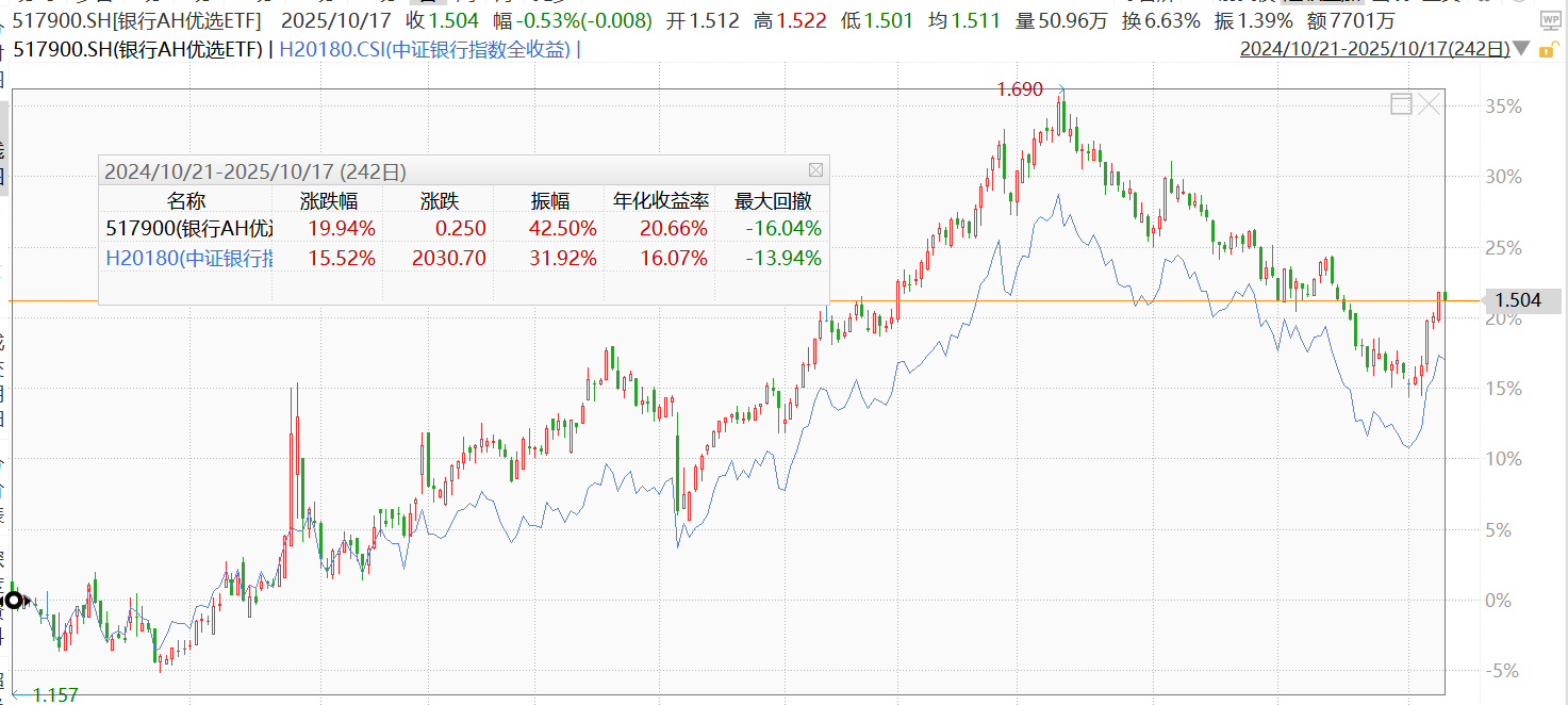 AH价格优选月度证券类别转换策略确实有效,从历史表现看,近一年银行AH优选ETF(517900)累计涨19.94%,同期中证银行全收益指数涨15.52%,仅一年就跑出4.42%的超额收益。