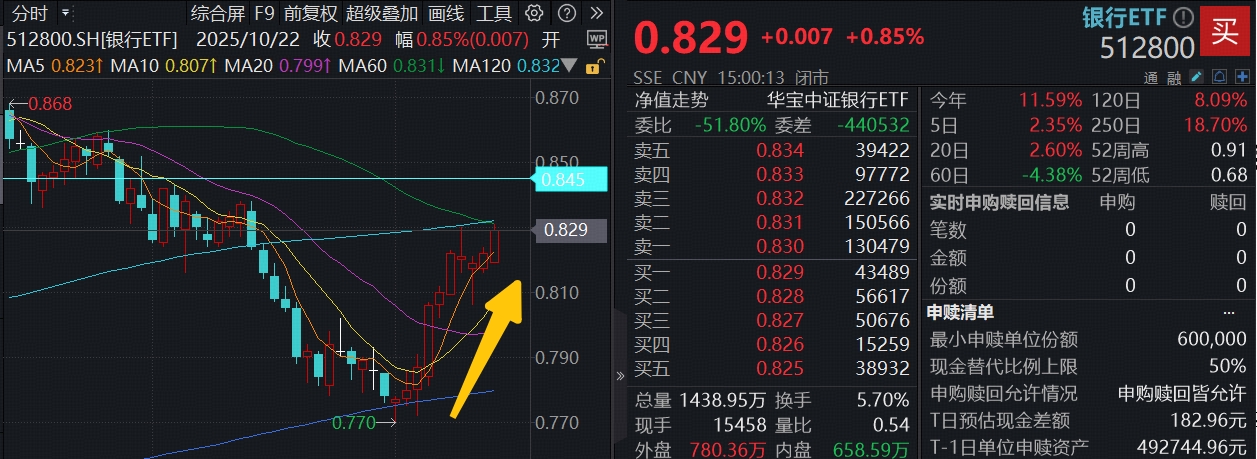 双百亿顶流银行ETF(512800)低开高走,场内价格逆市收涨0.85%,日线强势10连阳,向上逼近半年线,全天成交额11.89亿元。