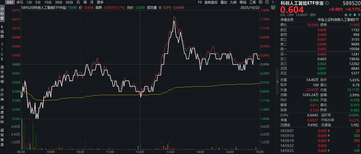 算力芯片股午后走强,寒武纪领涨超4%,总市值重返6000亿元。合合信息、芯原股份等个股涨逾2%,重点布局国产AI产业链的科创人工智能ETF(589520)午后快速冲高,场内涨幅最高上探1.33%,后涨幅略有缩窄,最终收涨0.17%,斩获日线2连阳。