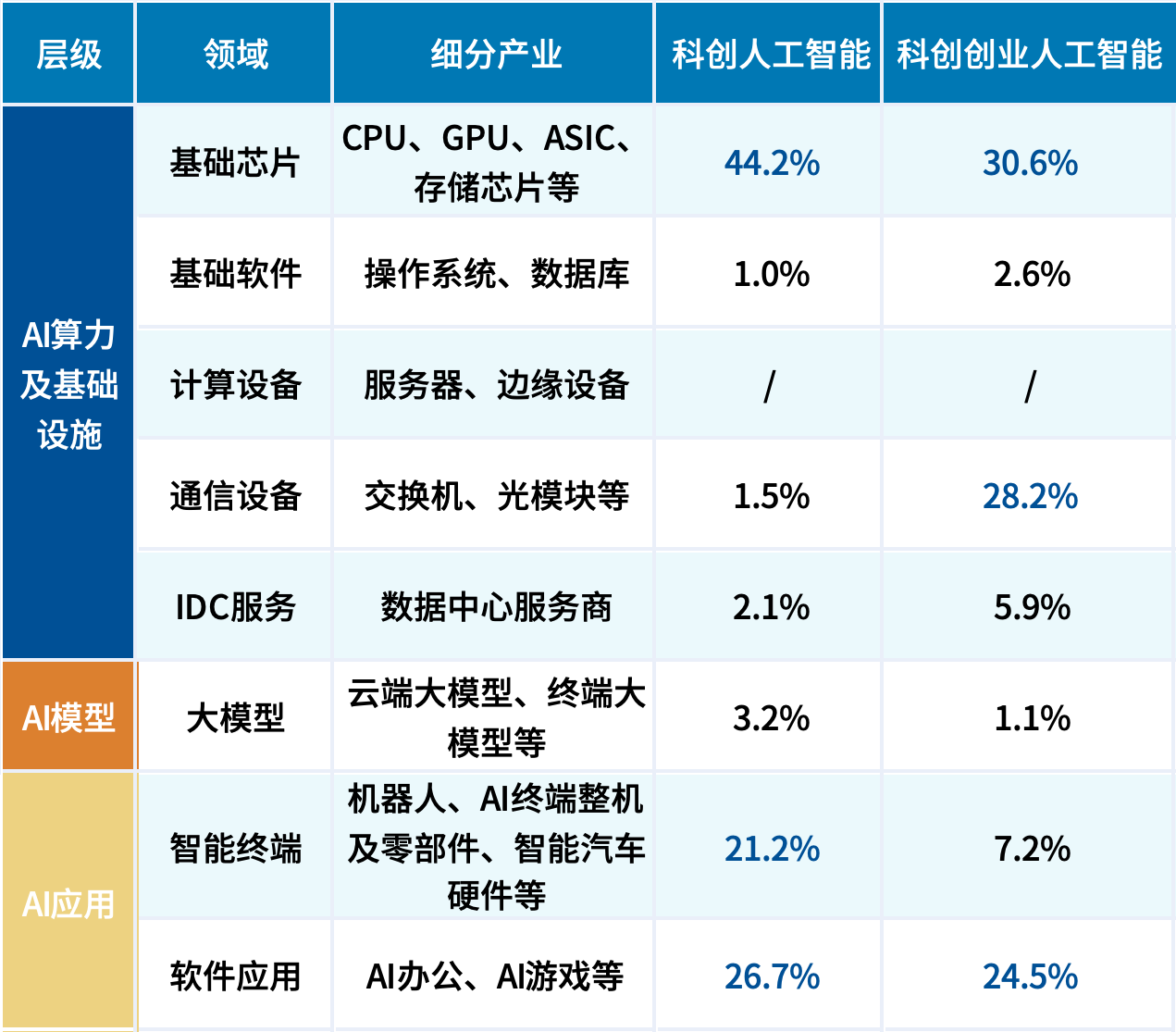 总结而言,科创 AI 指数的成份股更聚焦科创板硬科技,侧重AI芯片与应用端;科创创业 AI 指数则兼顾科创板与创业板,行业分布更均衡,覆盖了通信设备、AI多元应用等行业领域,形成了跨板块、多行业的成份股矩阵。