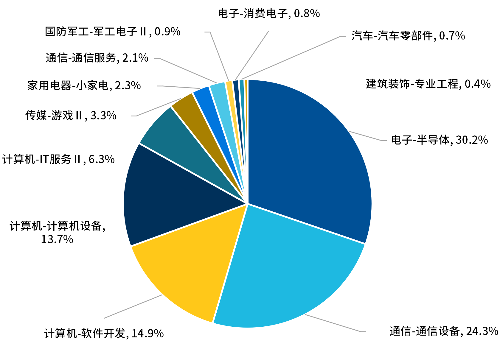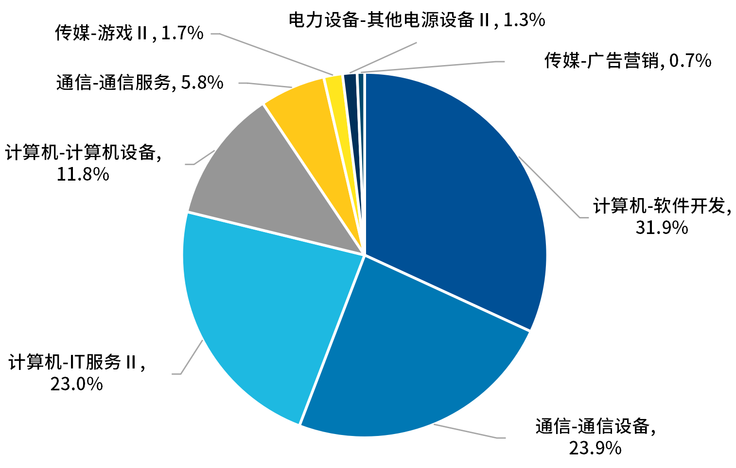 人工智能指数一定程度侧重于人工智能产业链的全方位覆盖,所涉及的行业既包括算力环节相关的电子、通信行业,也有大模型和应用相关的计算机、传媒等领域,行业分布相对均匀。