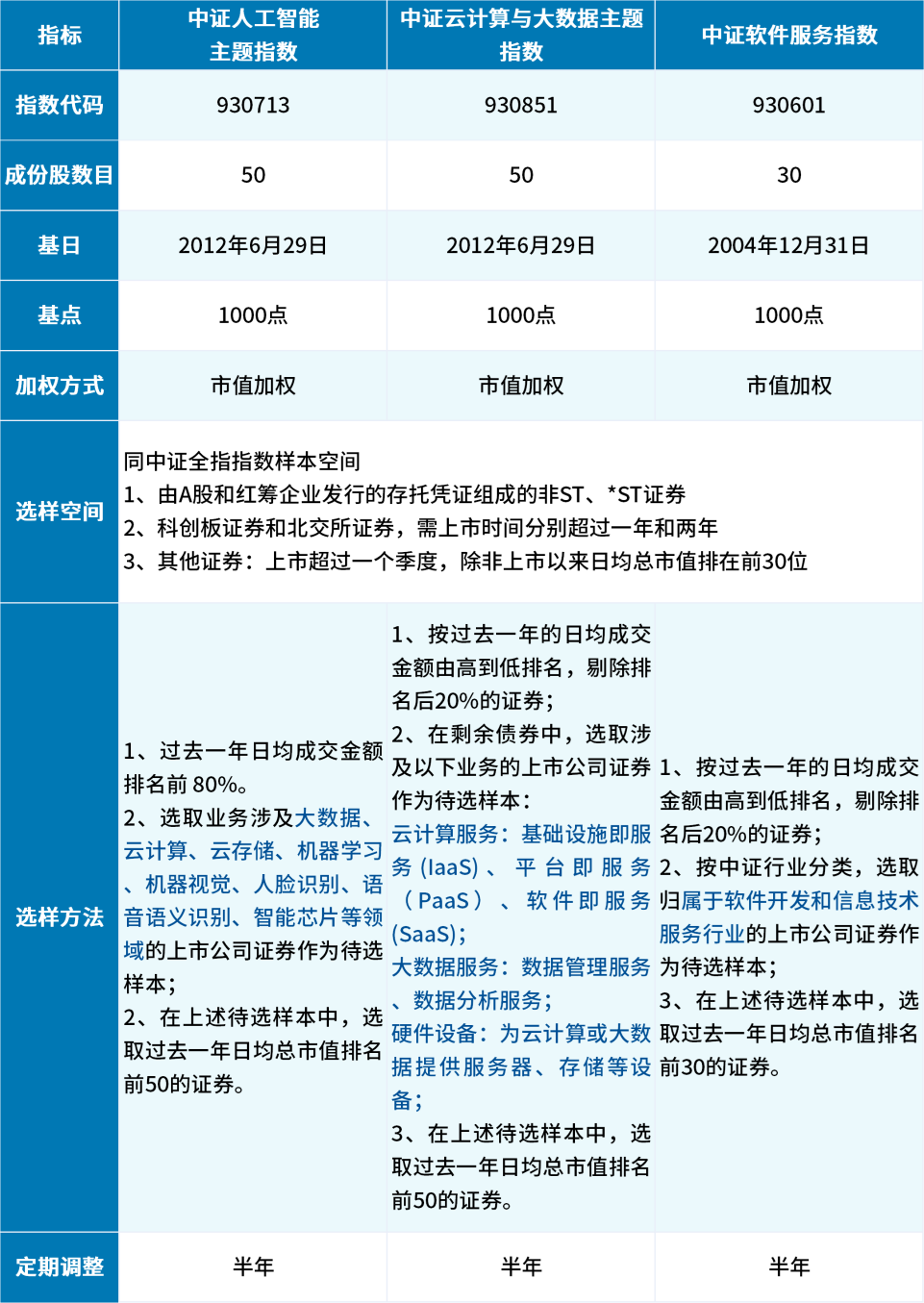 【要点:选样范围各有侧重,人工智能指数覆盖人工智能全产业链,云计算与大数据指数侧重产业链中游,软件服务指数更侧重于覆盖产业链下游软件应用环节】