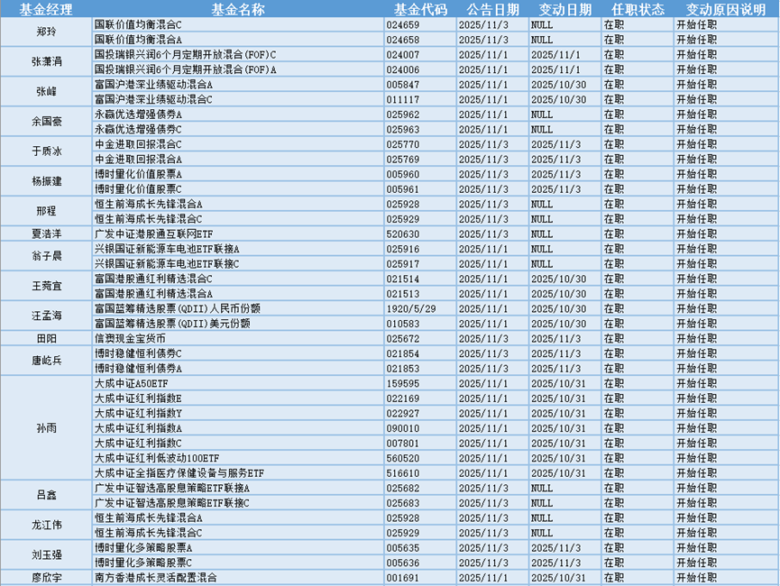 新基金经理上任方面,富国基金张峰现任基金资产总规模为166.86亿元,管理过的基金多为混合型和指数型基金,任职期间回报最高的产品是富国中国中小盘混合(QDII)人民币A(100061),为混合型基金,在任职的13年又63天时间内获得358.88%的回报,至今仍在管理该基金。新上任富国沪港深业绩驱动混合A、富国沪港深业绩驱动混合C这两只基金产品的基金经理。