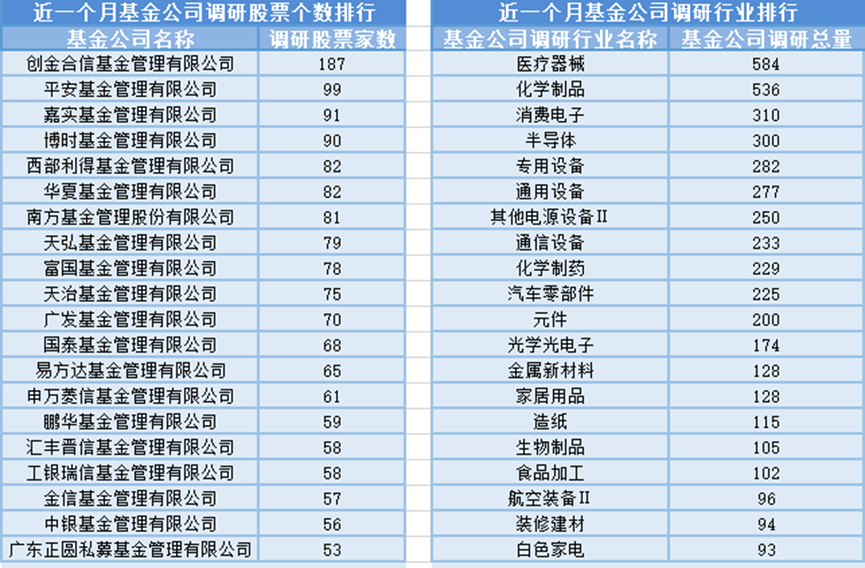 近一个月(10月4日-11月3日),创金合信基金参与公司调研的数量最多,共调研187家上市公司,然后调研较为活跃的还有平安基金、嘉实基金和博时基金,分别调研99家、91家、90家上市公司;从调研行业上来看,基金公司对医疗器械行业的上市公司调研次数最多,共有584次,其次是化学制品行业,基金公司调研了536次。