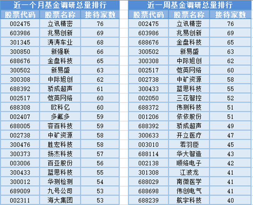 从个股调研情况上来看,最近1个月(10月4日-11月3日)最受公募基金关注的是立讯精密,属于消费电子行业,主营业务为从事消费电子、通信及数据中心、汽车、医疗等领域相关零组件、模组及系统集成业务。共有76家基金管理公司参与调研,其次是兆易创新和涛涛车业,分别接受69家、68家基金管理公司的调研。