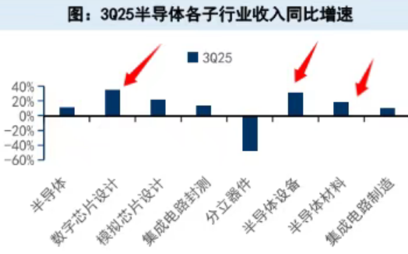 具体来看,2025年3季度半导体收入同比增长11.0%,环比增长3.4%。其中数字芯片设计(+35.0%)、半导体设备(+32.4%)、模拟芯片设计(+22.0%)、半导体材料(+18.61%)同比增速较高,半导体设备(+28.4%)、数字芯片设计(+7.1%)环比增速亦较高。