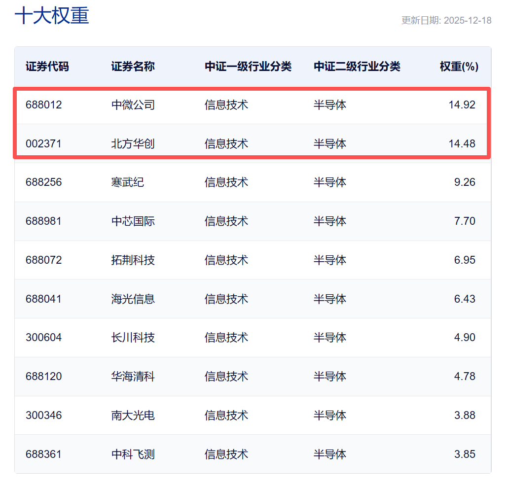 中证指数官网数据显示,半导体设备ETF(561980)跟踪中证半导,标的指数中半导体设备含量超5成,覆盖中微公司、北方华创、寒武纪、中芯国际、海光信息等各大细分龙头,前十大集中度将近8成。
