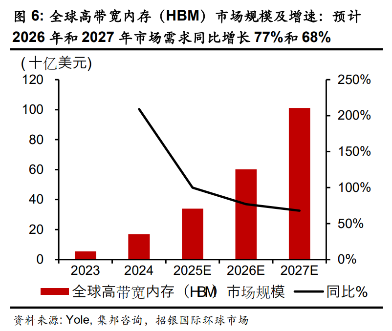 据集邦咨询预测,2027年HBM4E将占据整体高带宽内存需求的40%;当前高带宽内存市场供应缺口显著,供需紧张的局面预计持续,或将支撑2026年和2027年高带宽内存需求同比分别增长77%和68%。