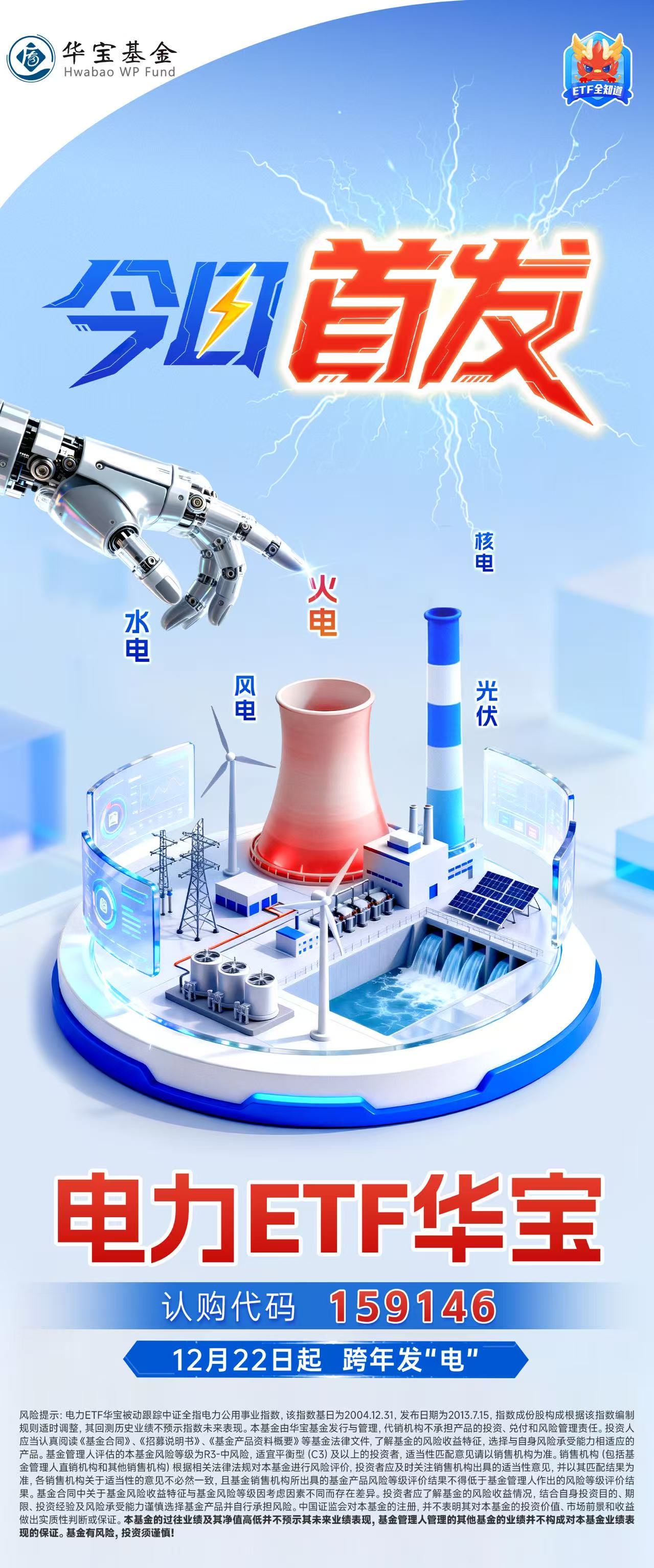 自12月22日(周一)起,千亿ETF大厂华宝基金开始发行重磅新品“电力ETF华宝(159146)”,指向十分明确——把握AI相关能源机遇,为AI发“电”!该ETF将跟踪中证全指电力公用事业指数(H30199.CSI),通过成份股“火、水、风、核、光”的多态电力配置,助力投资者在AI大时代战略性地实现“全电布局,攻守兼备”。