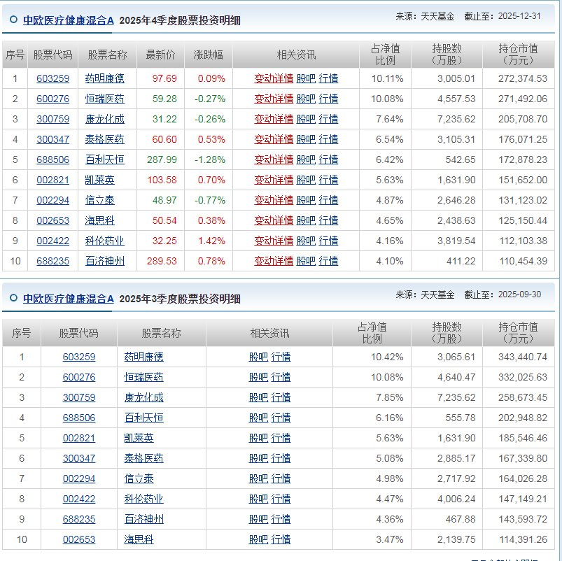 持仓方面,中欧医疗健康的前十大重仓股依次为:药明康德(603259.SH)、恒瑞医药(600276.SH)、康龙化成(300759.SZ)、泰格医药(300347.SZ)、百利天恒(688506.SH)、凯莱英(002821.SZ)、信立泰(002294.SZ)、海思科(002653.SZ)、科伦药业(002422.SZ)、百济神州-U(688235.SH)。其中,海思科、泰格医药获增持,科伦药业、信立泰等多只个股遭减仓。
