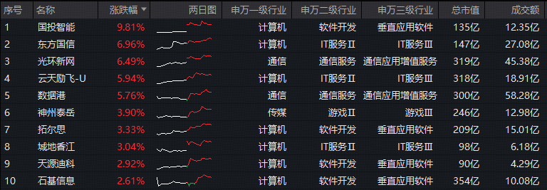 成份股方面,国投智能领涨超9%,东方国信、光环新网涨逾6%,云天励飞、数据港、神州泰岳等个股跟涨。