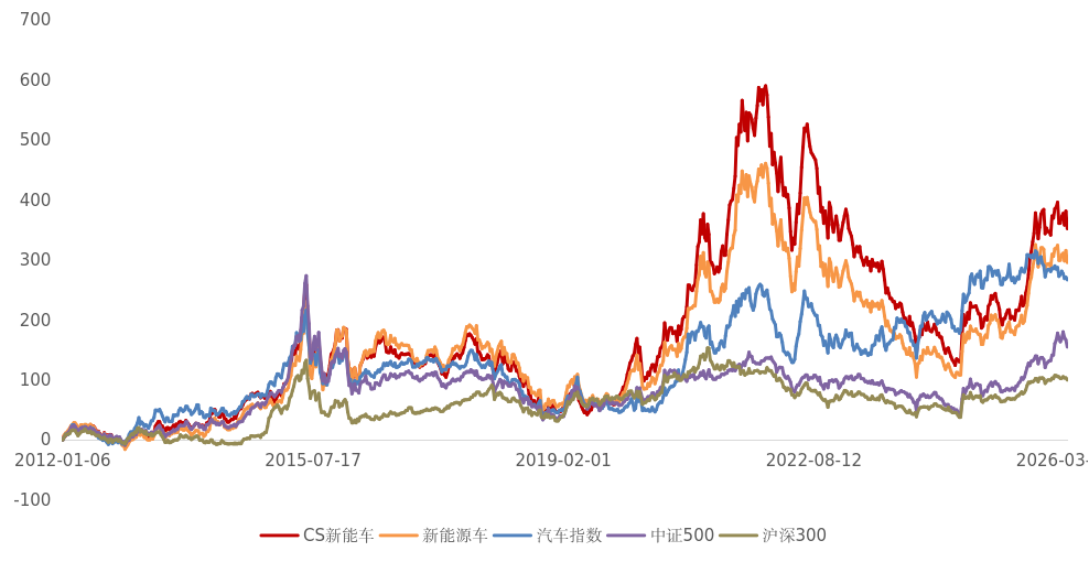 基期以来(2011.12.31-2026.03.23),该指数区间涨跌幅329.98%、区间年化收益率11.14%、年化夏普比率0.50,表现均优于同期国证新能源车指数和中证全指汽车指数。