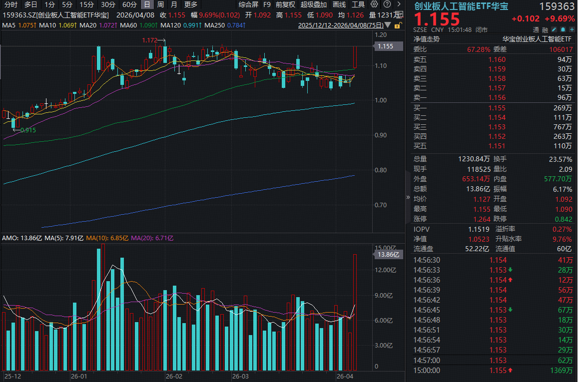 热门ETF方面,20CM高弹性的创业板人工智能ETF华宝(159363)跳空飙升,场内单边上扬收涨9.69%直逼前高,爆量成交超13亿元,交投居全市场AI主题类ETF首位!火热行情吸引资金布局,创业板人工智能ETF华宝(159363)单日净申购2.06亿份,按当日场内均价估算吸金超2亿元。