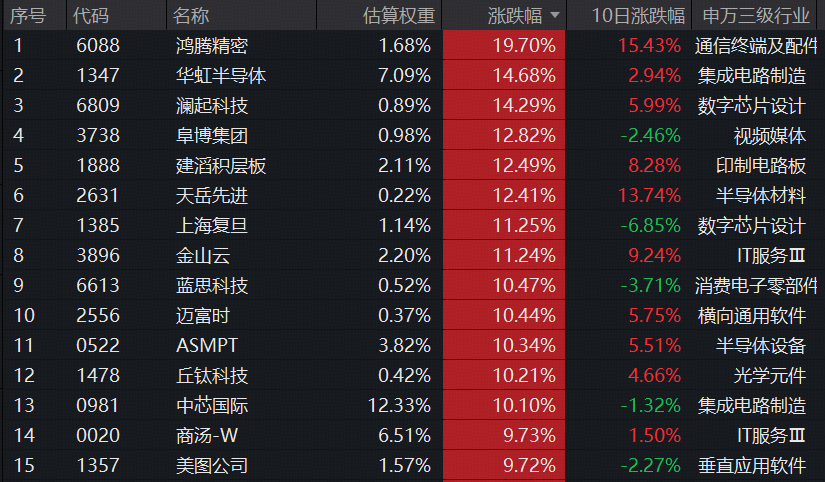 板块内50只成份股全线飘红!鸿腾精密、华虹半导体、澜起科技、阜博集团、建滔积层板、天岳先进、上海复旦、金山云、蓝思科技、迈富时、ASMPT、中芯国际等13股批量涨超10%。