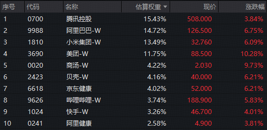 权重龙头集体大涨,腾讯控股涨3.84%,阿里巴巴-W午后一度直线冲击8%,收涨6.75%,小米集团-W亦大涨6%,美团-W飙涨超10%!