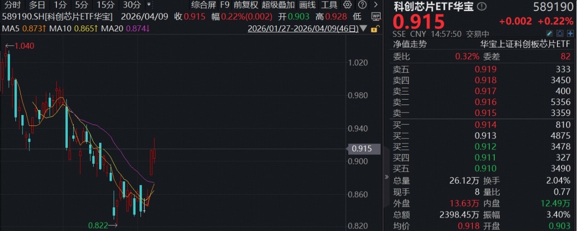 A股震荡整理,科创芯片逆市活跃,全“芯”布局芯片产业的科创芯片ETF华宝(589190)场内价格一度涨逾1%,收涨0.22%,喜提4连涨。