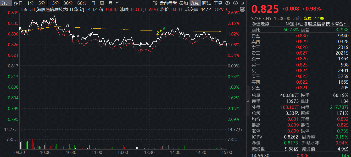 港股硬科技再度发力,同类规模最大、流动性最强*的港股通信息技术ETF华宝(159131)一度冲高逾2%,午后维持红盘震荡,最终收涨0.98%,单日成交额3.33亿元,全天溢价明显,单日资金申购2500万份,周线放量长阳止步三连阴。