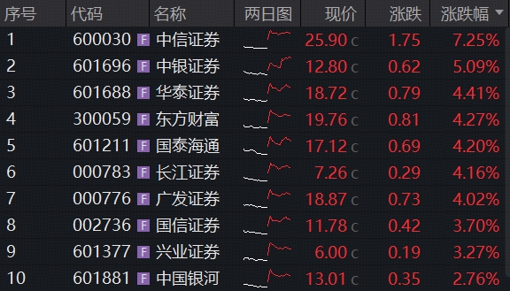 个股集体走强,中证全指证券公司指数囊括的49只成份股涨幅中位数达2.11%。龙头券商携手猛攻,“券业一哥”中信证券绩后高调领涨,涨幅一度超9%;华泰证券、东方财富、国泰海通、广发证券等涨幅居前。