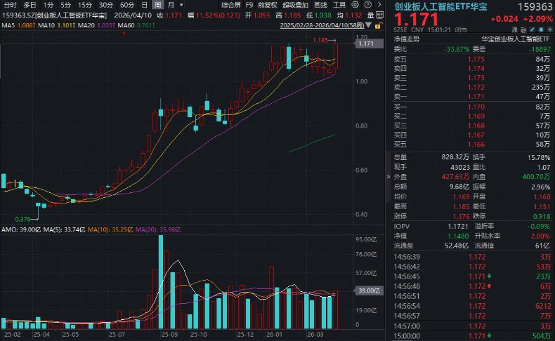 热门ETF方面,重仓光模块龙头的创业板人工智能ETF华宝(159363)继续走强,收涨2.09%创下历史新高,单日成交9.68亿元。复盘看,159363本周加速突破,单周场内累计拉升11.52%,周线斩获五连阳!