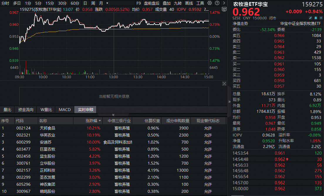 此外,畜牧养殖发力,天邦食品、华英农业、安迪苏三股涨停,全市场首只农牧渔ETF(159275)盘中场内价格涨超1%。