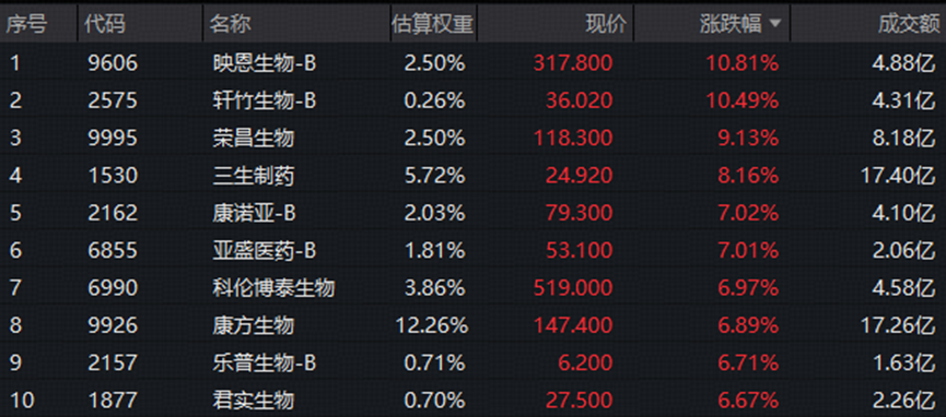 50只成份股中43股收涨,轩竹生物-B新药获批III期临床研究,盘初一度狂飙逾22%,收涨10.49%。映恩生物-B拟冲刺科创板IPO,股价暴涨10.81%。权重龙头集体大涨,三生制药涨8.16%,康方生物涨6.89%。