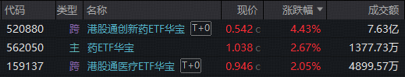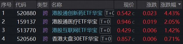 港股创新药彰显高弹性,100%创新药研发标的——港股通创新药ETF(520880)场内价格劲涨4.43%;港股医疗核心资产——港股通医疗ETF(159137)收涨2.05%放量连阳。