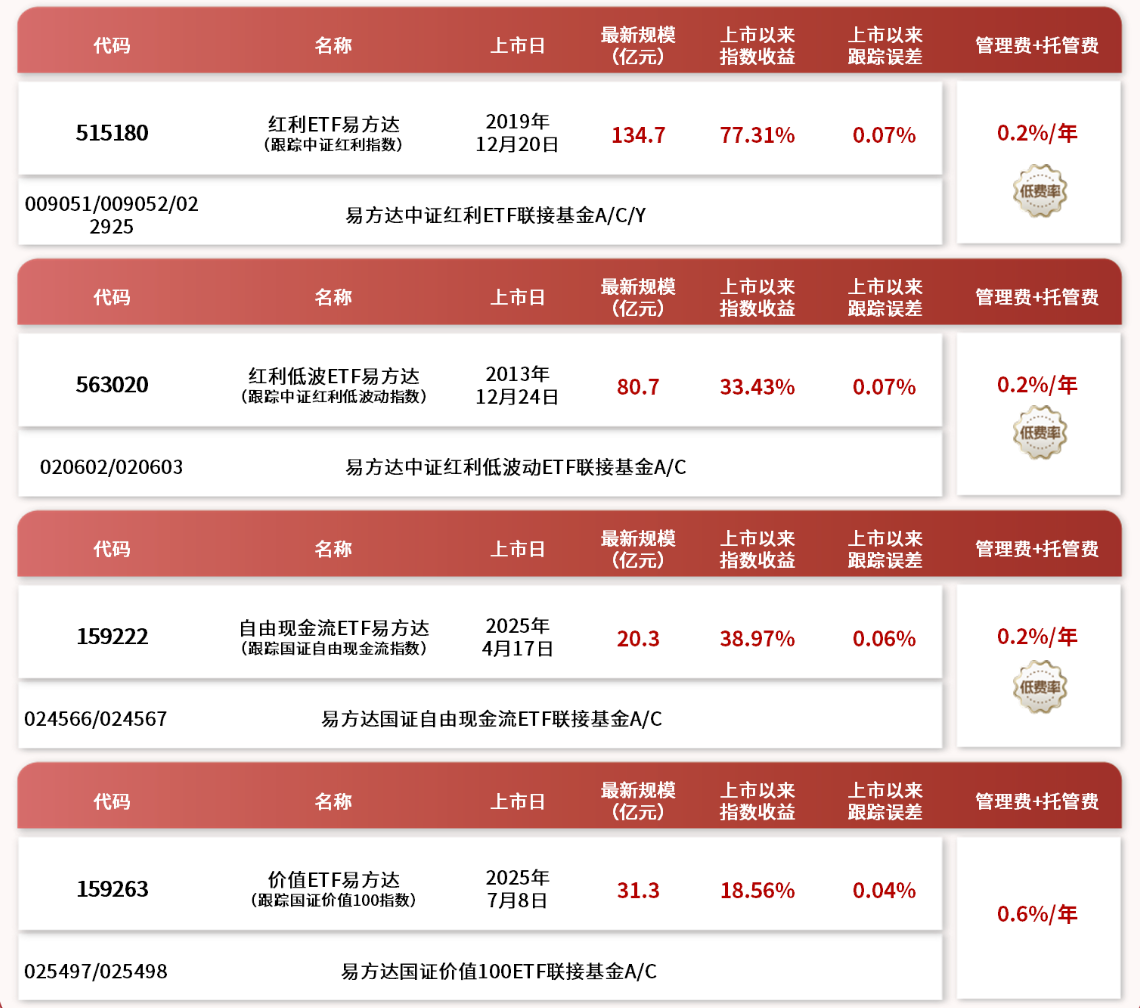 易方达基金旗下 “红利 +” 策略相关ETF基本情况跟踪,详见下图所示: