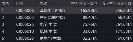 资金面上,基础化工板块近日获主力资金大举涌入。数据显示,截至收盘,基础化工板块单日获主力资金净流入165.98亿元,净流入额在30个中信一级行业中高居首位;近5日,基础化工板块累计吸金额更是高达256亿元,吸金额在30个中信一级行业中位居第2。