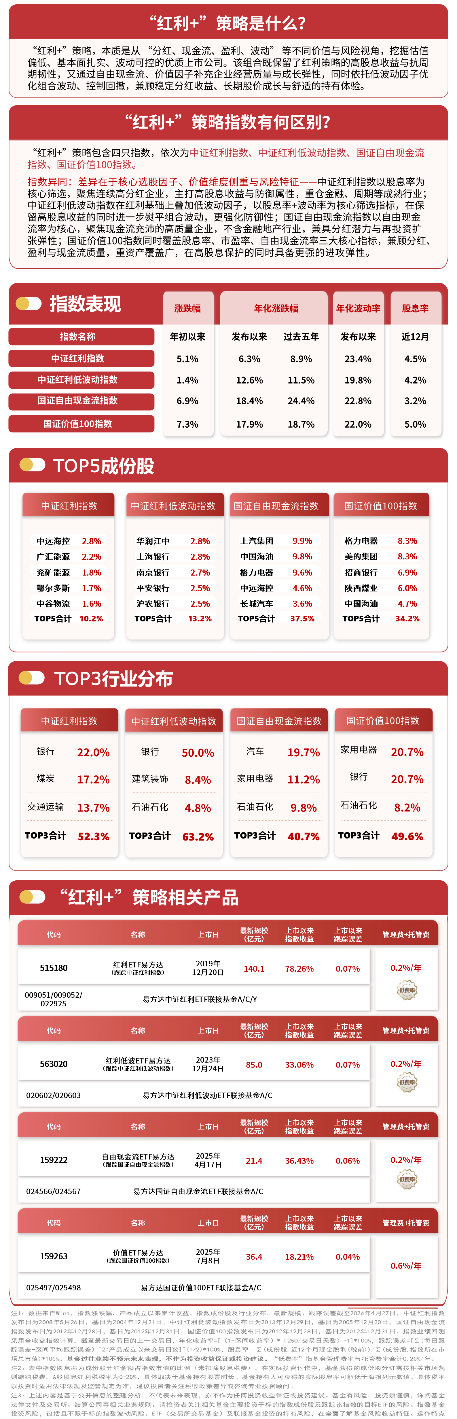 有分析指出,国证价值100指数目前股息率达5%,指数权重行业包括银行、石油、化工、煤炭、家电等,既具备较高防御性,又相对受益于石油等大宗商品价格涨价;该指数聚焦深度价值,以低估值配置“高股息且高自由现金流”公司,长期业绩优异,适合作为稳健底仓。